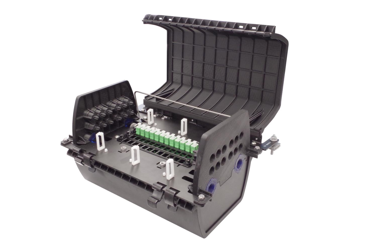 - Hasta 72 empalmes de cinta o 24 empalmes de tubos sueltos por bandeja (máximo de tres bandejas)